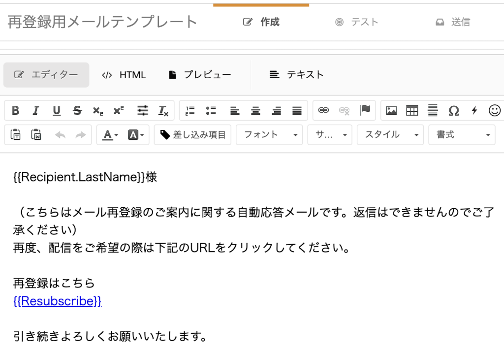 {{Resubscribe}}が設定されているメールテンプレートが作成されました。テキスト形式の方も同様に設定して下さい。