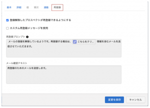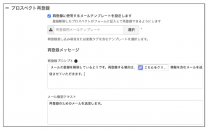 - 設定する際は、再登録用のメールテンプレートの作成とフォームに表示する再登録用メッセージの文言を用意してから設定する