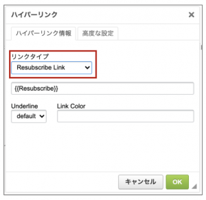 {{Resubscribe}}が挿入されました。みらいまではそのリンクに再登録用のリンクを指定したかったので、リンクタイプとして「Resubscribe Link」を設定しOKボタンをクリックします。